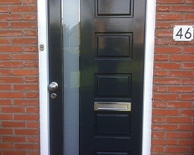 Een mooie hardhouten voordeur geplaatst met een gezandstraalde isolatieruitje en RVS beslag.
