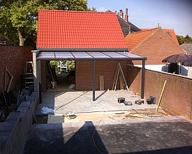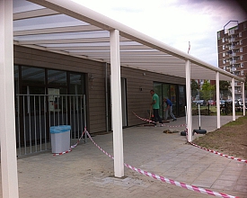 Voor de speeltuin in Terneuzen een nieuwe veranda geplaatst. 20 meter lang en een uitslag van 4 meter en aansluitend om de hoek nog eens 8 meter met een uitslag van 2 meter.
