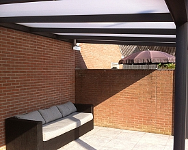 Overkapping uitgevoerd in grijze poedercoating en een dubbelwandige polycarbonaat dakplaat.